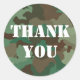 Le Merci est écrit dans un texte blanc en gras sur un motif de camouflage militaire vert. Excellente façon de sceller les faveurs de mariage ou de vous remercier notes.
