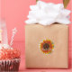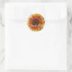 Une photo de tournesol orange remplit cet autocollant rond. Le Merci est écrit en écriture blanche sur l'autocollant.