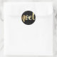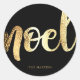 L'autocollant de Noël noir et or moderne et glamour présente un joli script Noel en faux or sur un arrière - plan noir, et est personnalisé avec votre nom de famille.