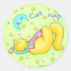 Cat Nap chat fait ce que les chats font le mieux - la sieste. Cet autocollant correspond à la papeterie et à l'invitation. Elle porte un adorable top rose avec des étoiles et des manches à rayures aqua. La lune est suspendue au-dessus du chaton Cat Nap, regardant de plus en plus avec un sourire. Kitty a aussi un sourire béant pour que vous sachiez qu'il a de doux rêves. Le texte de "Cat Nap" est sur un arrière - plan vert citron parsemé d'étoiles jaunes et de points roses. L'image est entourée d'une bordure brillante et colorée. Cat Nap cat est l'un des 10 chats de la collection de tissus "Meow Meow" de Phyllis Dobbs.