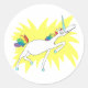 Un autocollant blanc circulaire avec une licorne dessus. La licorne a les cheveux arc-en-ciel. De plus, la licorne brille.