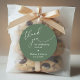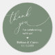 Modern Wedding minimalist "Thank You for celebrating with us" Cookies and Gifts Round Sticker, in romantic script, little heart, with bride and groom signature and wedding date, sage green theme wedding favors label.