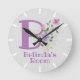 Horloge De Chambre Enfants. Le design présente Monogram & Name avec Fleurs de chaque côté dans un style pastel couleur eau. Le nom de l'exemple est Belinda. Changez le nom comme souhaité pour toute personne ayant un nom commençant par B.