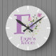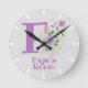 Horloge Des Enfants. Le design présente Monogram & Name avec Fleurs de chaque côté dans un style pastel couleur eau. Le nom de l'exemple est Faye. Changez le nom comme souhaité pour toute personne ayant un nom commençant par F.