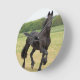 Un cheval friésien noir galopant dans un champ.