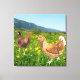 This is the first of three versions of a lovely colourful canvas, that will bring a breath of the countryside into your home. It shows a jaunty Cockerel ardently running towards a chicken in a Spring flower meadow that I spotted in France and sketched. Lovely to brighten up any room and good on its own or with the other two canvas’s to tell an amusing story.