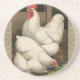 A rustic art print displaying a vigourous rooster and a hen in a hen house. The darc ecru border is pattern consists of spiral elements. This print would be a gread addition to a rural country home decoration.