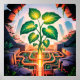Un plante brillant traverse la pierre et les circuits, alimentés par la lumière et reliés par des racines. Cette conception inspirée du solarpunk célèbre la résilience, le renouveau et la tranquillité de l'énergie verte qui s'installe dans un monde fracturé.