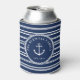 Preppy can coolers printed with a nautical monogram. Add your family name inside a rope circle, curved over a white anchor against a striped background in white and blue.