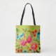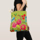 Cheerful rose and cherry floral pattern on your choice of lovely tote bag. A very fresh and summery design. Available in your choice of strap options. Customizable in your choice of background colour on both front and back (This item shown in vibrant yellow green). A bright and original floral addition to your day. Sweet.