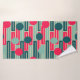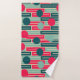 Ce kit de serviettes est doté d'un linge rose, d'une serviette de bain bleu clair et d'une serviette de bain au design moderne du milieu du siècle avec des rectangles extensibles en rose, turquoise et bleu avec des cercles superposés.
