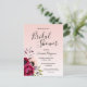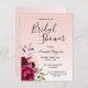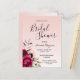 Devant : Une invitation à la douche nuptiale moderne et élégante. Un arrière - plan à l'ombre d'or rose. Décoré de fleurs violettes foncées et bordeaux et roses roses. Modèles pour le nom, la date et le lieu de la douche de la mariée. Le texte : Fête des mariées est écrit avec un grand script de style écrit à la main, des lettres de couleur noire. Retour : rose or ombre arrière - plan.