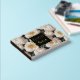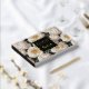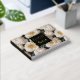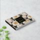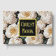 A simple yet eye-catching elegant seamless pattern featuring large ivory white rose flowers in full bloom with pale peach stamens set against a deep green leaf background that has a square black inlay edged with real gold foil. A text template for your custom wording reads "guest book" on the front and your personalized title will appear on the spine, which is black in colour too. Both text templates are real foil creating a timeless and luxury look to the cover.