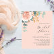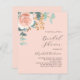 A trendy peach coloured background. Decorated with a rose gold and blush pink floral, rose flower and green watercolored eucalyptus leaves, sprigs, greenery and a faux gold sprig. Personalize and add the name of the bride to be and party details.