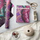 Array of richly coloured embroidered fabric and rose print wrapping paper. In colours of purple, teal, orange, pinks, green and gold. Rich bohemian print.