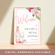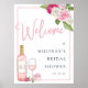 Colourful bridal shower welcome sign for wine lovers features accents of roses in pink and ivory with lush greenery peeking out, and a bottle and glass of rosé wine. Personalize with your bridal shower event name and date in elegant blush and grey-blue typography accented with handwritten style calligraphy, and customize the wine bottle with the couple's initials.