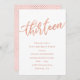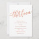 Rose Gold 13th Birthday Party Invitations : Joli or rose 13th anniversaire conception d'invitation de fête avec brillant rose or look "treize" écrit en écriture manuscrite typographie. Le lettrage contemporain remplit les détails de la fête. [Notez que même si les éléments de cette conception seront imprimés pour ressembler à du papier d'aluminium, aucun papier d'aluminium ou encre métallique n'est utilisé pour créer les invitations - le papier d'or rose est un effet imprimé.]