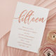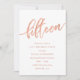 Rose Gold 15th Birthday Party Invitations: Pretty rose gold 15th birthday party invitation design featuring bright rose gold foil look "fifteen" written in hand-lettering script typography. Contemporary lettering fills out the party details. [Note that while elements of this design will print to look like foil, no actual foil or metallic ink is used in creating the invitations - the rose gold foil is a printed effect.]