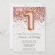 Rose Gold 1st Birthday Party Invitation and rose gold elegant modern 1st birthday party invitation for a 1 year old girl with modern script writing and fun foil balloons with printed texture paper background.
