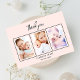 Add 3 of Your birthday photos, vertical size, a date, name, and the thank you note. A rose gold, blush background with black text and frame. Personalize and add your thank you note and name.