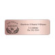 A wedding save the date, return address labe. A rose gold faux metallic looking background. Decorated with a laurel wreath. Personalize and add your wedding date, names, address and family monogram initial.