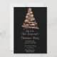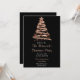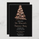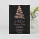 A rose gold christmas tree on a black background. The back of the invite is black with snow pattern