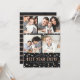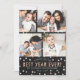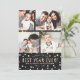 Cute family New Years holiday photo cards with four photos, and white and rose gold glitter look text and confetti dots. Personalized with your own photos and name(s). Textured black background. [Note while some elements of this card have been designed to look like gold glitter, no actual glitter will be used in making the invitations - it is just a printed effect.]