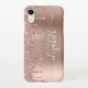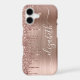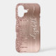 Custom elegant and girly phone case featuring rose gold faux glitter dripping against a rose gold faux metallic foil background. Personalize with your name in a stylish trendy white script with swashes.