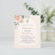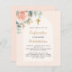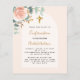 Rose gold, blush arch background decorated with a rose, eucalyptus greenery and a golden cross. Personalize and a name and ceremony details. Black and golden coloured letters.