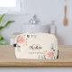 A cream coloured background, black and golden text. Decorated with watercolored rose gold roses, eucalyptus greenery and golden sprigs.