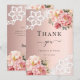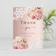 A modern and elegant non photo thank you card. A rose gold gradient background. Decorated with rose gold and blush pink roses, florals flowers and lace. On the front the text: Thank You