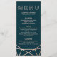A winter wedding menu, features a "faux foil" gold rose geometric pattern over a dark turquoise background. All your details are spelled in a beautiful modern typo.