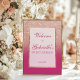 This glamourous sweet sixteen welcome sign features a faux rose gold glitter border fading into a rich pink ombre background, with elegant serif and script fonts to celebrate the birthday girl. Perfect for making a statement at the entrance of the party, it can be personalized with the guest of honour’s name and date. A sparkling way to set the tone for a night to remember.