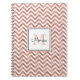 Personalized spiral notebook features faux rose gold glitter chevron pattern with custom name in black handwriting font and monogram in matching rose gold shade in white square frame.