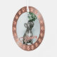 Upload two photos of any pup or kitty for this modern pet christmas tree ornament template. The front design features a simulated metallic brushed dusty mauve rose gold metal circular border, with copper terra cotta rose gold simulated glitter paw print cutouts, and a customizable name in a script typeface. the back allows for full image coverage, and has a border of spaced simulated metallic sparkling pink rose gold gliitter dust paw prints.