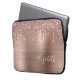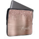 Elegant and girly laptop sleeve pad featuring rose gold faux glitter dripping down a rose gold faux metallic foil background. Personalize with your name in a stylish trendy white script.