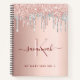 A faux rose gold metallic looking background with elegant rose gold, pink and faux silver glitter drips, paint dripping look. Personalize and add a name, monogram letter and a title. The name is written in burgundy with a large modern hand lettered style script with swashes. Perfect for school, work or as a your secret diary.