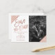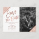 Rose gold glitter script white photo save the date postcard