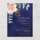 A navy blue coloured background. The blue colour is uneven. Decorated with a rose gold and blush pink floral, rose flower and green watercolored eucalyptus leaves, sprigs, greenery and a faux gold sprig. Personalize and add your names and details. White and golden coloured text.