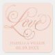 Seal your wedding favours with romantic elegance using this rose gold love script monogram square sticker. Ornate "Love" calligraphy in rose gold is paired with the couple's names and wedding date on a soft blush pink background. The warm metallic script against the feminine blush palette creates a dreamy, sophisticated accent. Perfect for favour bags, gift boxes, or wine bottles. All text is fully customizable.