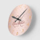 Personalize and add your monogram letters, initials and name. The monogram initials as a pattern on the background. A rose gold, pink faux metallic looking background. Dark rose gold coloured letters. Golden clock numbers. This clock is also available in our store with only the monogram pattern.