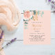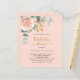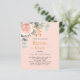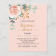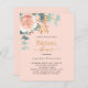 A trendy peach coloured background. Decorated with a rose gold and blush pink floral, rose flower and green watercolored eucalyptus leaves, sprigs, greenery and a faux gold sprig. Personalize and add the name of the bride to be and party details. Black, green and golden coloured text.