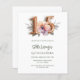A modern, stylish and glamourous invitation for a Quinceañera. White background, decorated with a peach and purple watercolored flower. The name is written with a modern green coloured hand lettered style script. Personalize and add your party details. Number 15 is written with a balloon style font, script.
