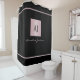 Trendy luxury exclusive looking monogrammed shower curtain featuring a faux rose gold pink metallic glitter square over a stylish classy black background. ++++++++ Personalize it with your name or family name and monogram name initial(s).