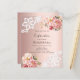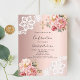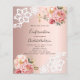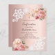 An elegant Confirmation invitation. A rose gold gradient background decorated with pink and rose gold florals, roses, lace and a golden cross. Personalize and add a name and details.