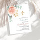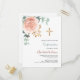 Rose gold and blush pink florals, eucalyptus greenery and a golden cross. Personalize and add a name and details.