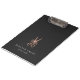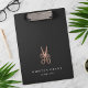 Chic personalized clipboard for your salon or hairstyling business features two lines of custom text in classic white lettering, on a rich charcoal grey background adorned with a pair of flower-embellished scissors in faux rose gold foil. Design repeats on reverse side.