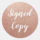 Create your own "signed copy" stickers against a printed rose gold metallic foil photo effect. Customize the font style, colour and size. Try black text rather than the white. Modern handwritten style typography cursive font.