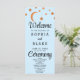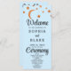 The predominantly simple block font ensures clarity and sophistication, allowing the celestial elements to take centre stage. The words "Welcome," "Ceremony," and "Wedding Party" are delicately rendered in a pretty decorative script font, adding a touch of whimsy and elegance to the overall design. These script elements infuse the program with a sense of enchantment, perfectly complementing the celestial theme.