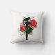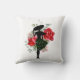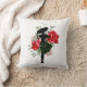Des roses rouges font grâce à ce carré lancer l'oreiller avec une silhouette mode design d'une femme au centre d'eux portant une grande jupe casquette et cailleuse qui a des vignes vertes fleuries.